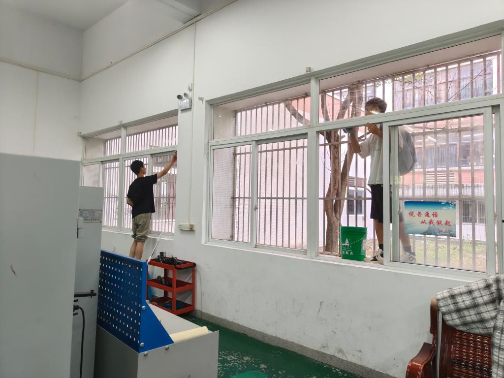 教研楼内,志愿者们仔细擦拭讲台、座椅和走廊栏杆,清理角落的灰尘,让老师们授课、同学们学习的地方干净明亮。